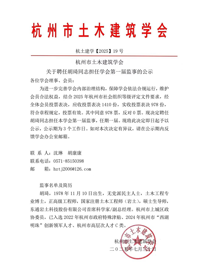 关于聘任胡琦同志担任学会第一届监事的公示