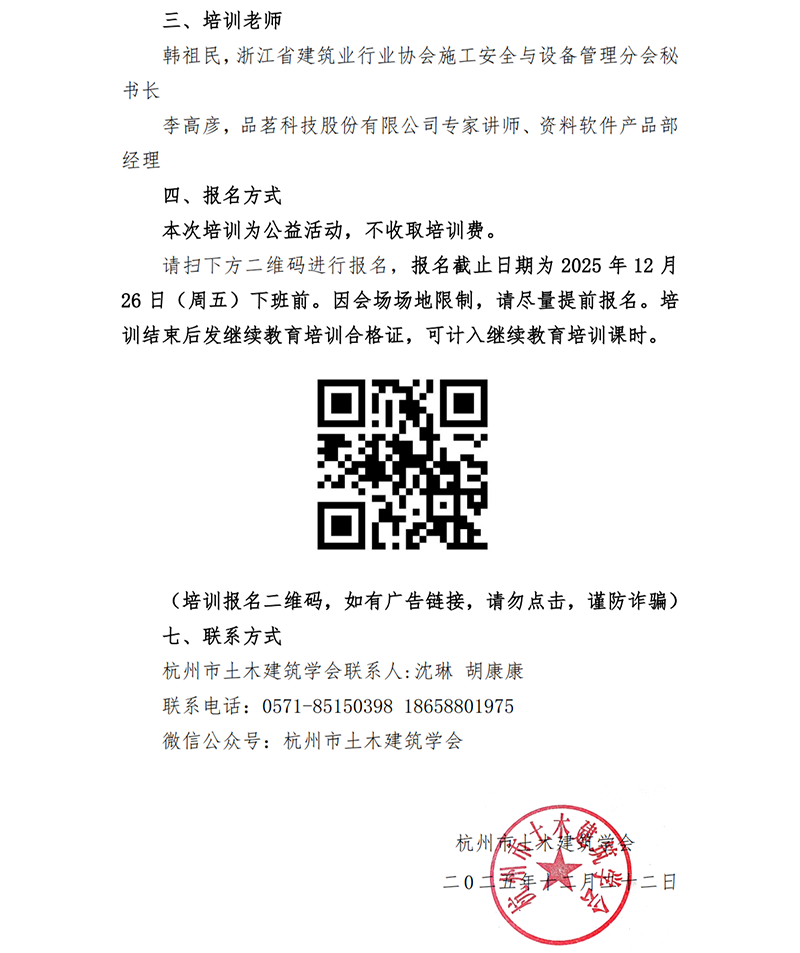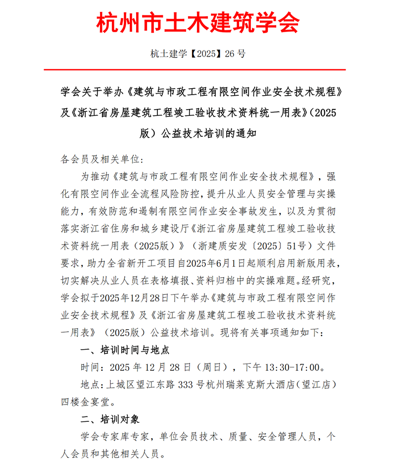 关于举办《建筑与市政工程有限空间作业安全技术规程》及《浙江省房屋建筑工程竣工验收技术资料统一用表》(2025版)公益技术培训通知